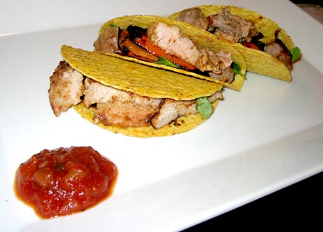 I cooked the pork over hickory wood in the BBQ. Heated the taco shells, stuffed them with lettuce and Thai basil from my garden, added BBQ orange pepper, and finished with the sliced BBQ pork.