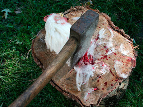 After a deep breath, I heaved and swung the axe, landing a clean blow as instructed. At that precise moment however, my uncle jumped back quickly, releasing the chicken from his hold. The bird’s headless body suddenly became animated, running straight at me—still standing there, axe in hand—spraying blood upward, onto itself and onto me. It frantically ran in circles, but silently all the while, bumping into objects in the farmyard until finally slumping to a final resting place against the house, twitching pathetically.