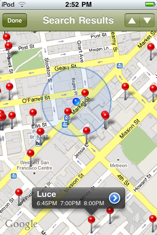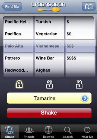 Shake to find a restaurant in your area (based on location services) or enter a city with the ability to lock down neighbourhood, cuisine and/or price. I almost never use it in Vancouver, because I always know where I want to go, but it’s fun and useful for travelling. Great interface.