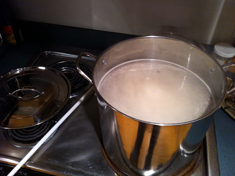 After killing the heat, the trick is to rapidly chill the wort as quickly as you possibly can. There are expensive pieces of equipment to help accomplish this, but my method of choice has been dunking the kettle in an ice bath in my kitchen sink. Ice packs work great since they won’t melt as quickly as ice cubes. The goal is getting it down from boiling to room temperature in under a half hour, but if you can’t accomplish this it’s not a big deal. Your beer will just be hazier, that’s all.