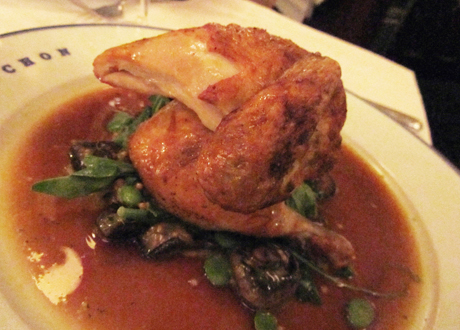 My chicken was amazingly succulent (I admit, I expected it to be a touch dry or not very hot, but it was neither) and I suspect, brined and dried prior to cooking. Every piece was as moist as the next and the outer skin was crispy and delicious. Perfectly paired with perfectly executed greens and mushrooms, the sauce was irresistible. Easily the best roast chicken I’ve ever had. I can’t speak for everyone else’s meals but there wasn’t much talking at first, then we began sharing samples saying, “Oh you have to try this. So good. So moist, “ and finally ending with mostly spotless plates.
