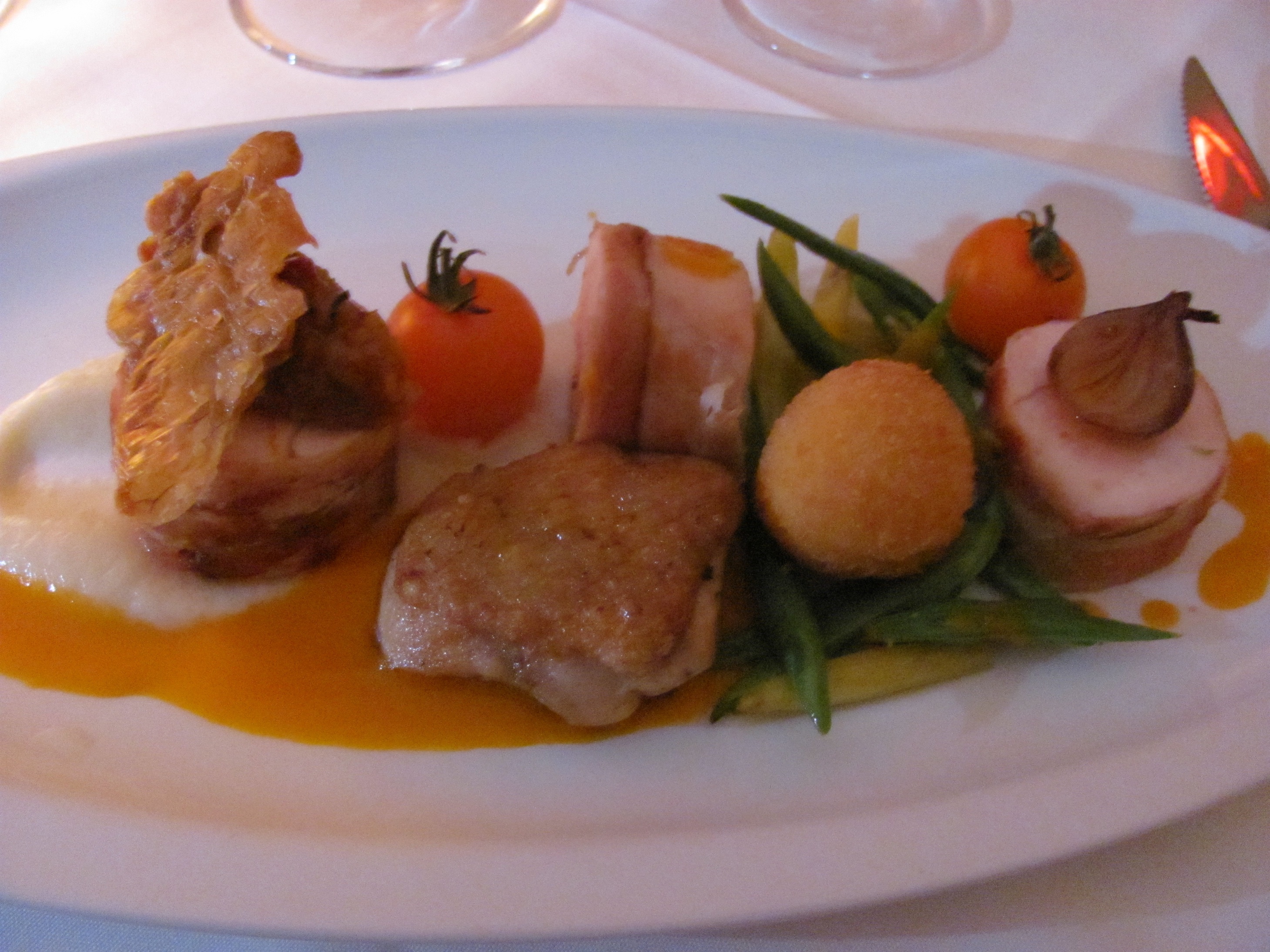 The main was a beautifully prepared plate of Maple Hill Chicken Breast, that was bacon wrapped (thank you) with a delicate accompaniment of summer beans, cipolinni onions, chicken leg, a simple cascade tomato glaze and much to everyone’s surprise a little deep-fried quail egg – so neat! Chef also incorporated a garnish of crispy chicken skin that was intense in flavour and gave me memories of stealing this delectable from my mom’s oven roasted chicken as a child.