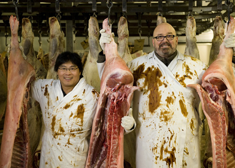 George Siu (L) and Park Heffelfinger (R) of Memphis Blues BBQ getting intimate with their menu.