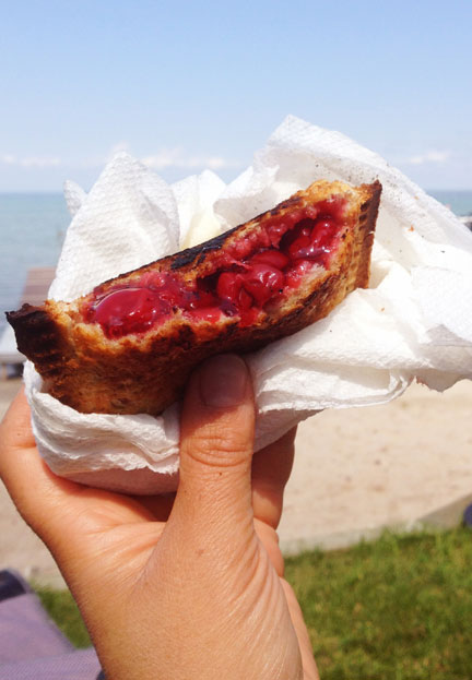 Using the jaffle iron is a super simple process. To begin you put the iron into the coals and let it get nice and hot, then open and melt butter – and I’m talking loads of butter – into one side. Proceed to make your sandwich, butter one side of the bread and place the unbuttered side into the iron. Close it up and stick it back in the coals and check it every little bit to make sure it’s getting nice and toasty brown. Once done trim the edges of the overhanging toast and voila, it’s done with perfectly crimped closed edges and loads of tasty filling. We made sandwiches with cheese, onion, tomato and mushroom and for dessert used cherry pie filling. Yup, the kind right out of the can and it’s to die for. One word of caution, these are super hot when they come out so wrap them in paper towels and wait a few minutes before biting in.